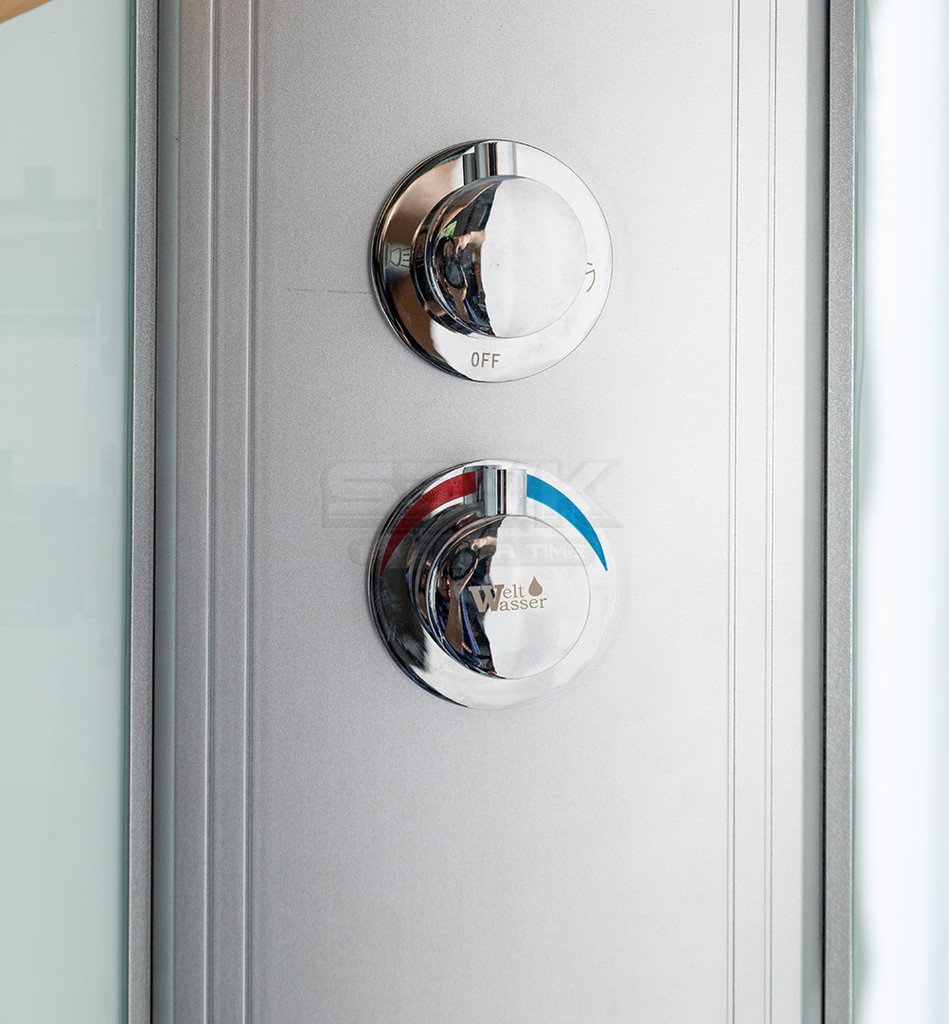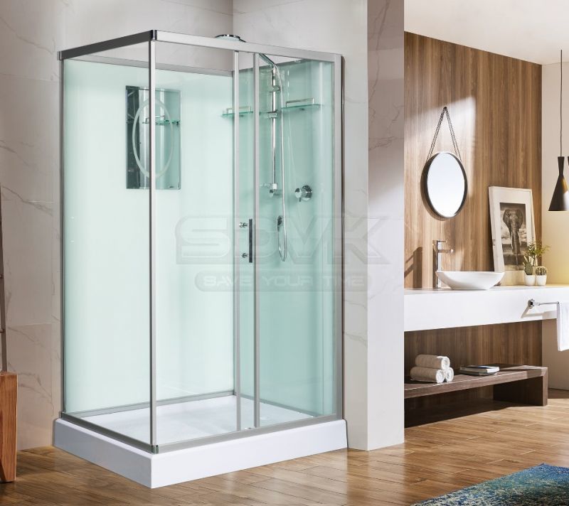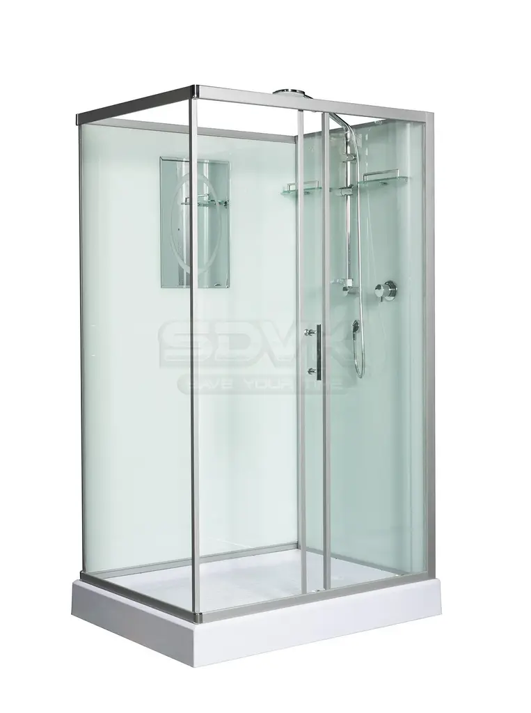 Задние стенки также изготовлены из закаленного стекла белого цвета. В комплекте предусмотрены полочки для размещения банных принадлежностей и зеркало, что добавляет комфорта при ежедневном использовании. Поддон кабины выполнен из акрила, имеет низкий тип (высота 16 см) и снабжен антискользящим покрытием, что делает водные процедуры более безопасными.