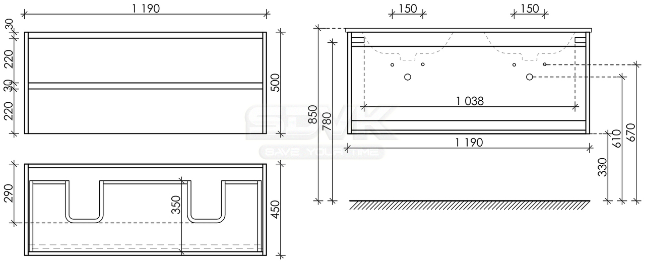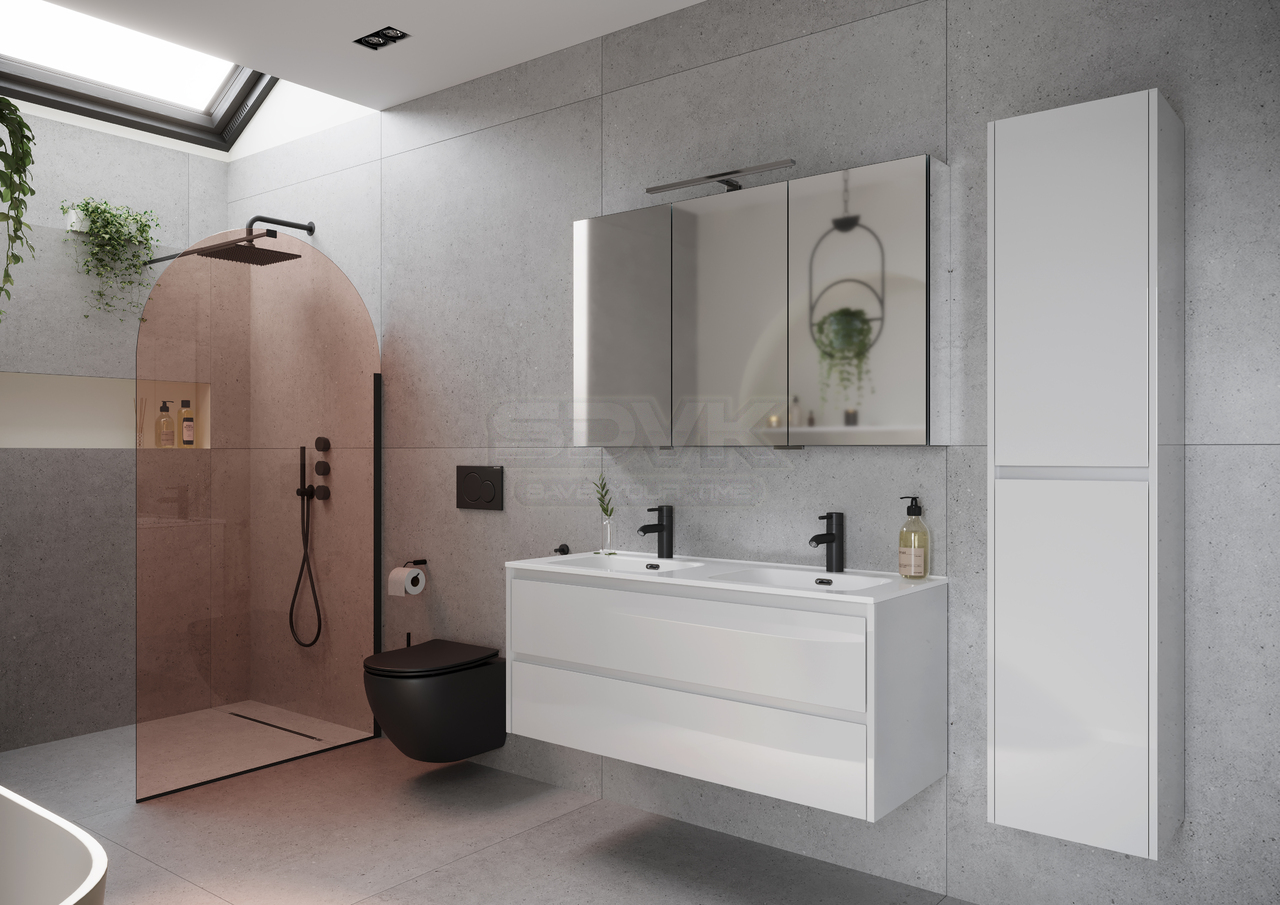 Тумба подвесная SANCOS Libra 1190х450х500 c двумя ящиками оснащенными доводчиками скрытого монтажа с системой Soft close (плавного закрывания), c фрезерованными ручками по всей длине фасада, белый глянец , арт. LB120-2W